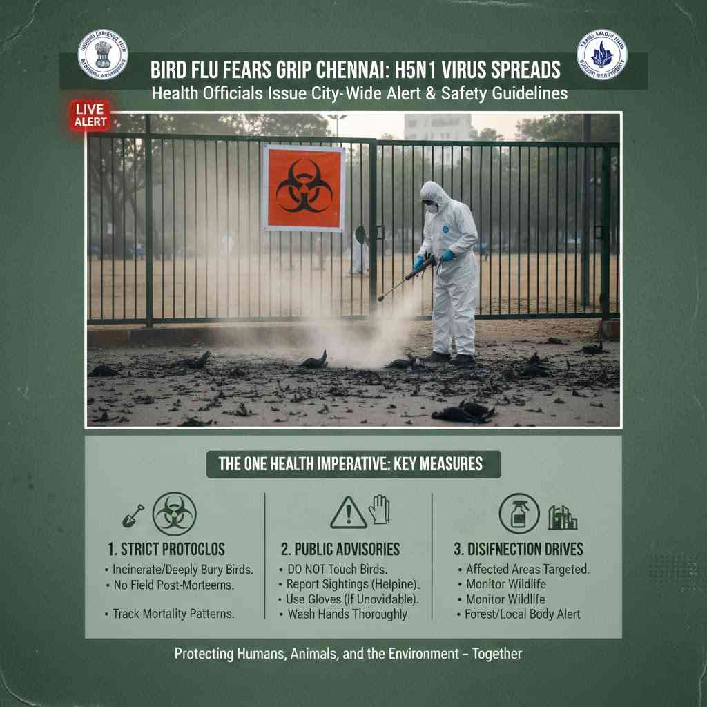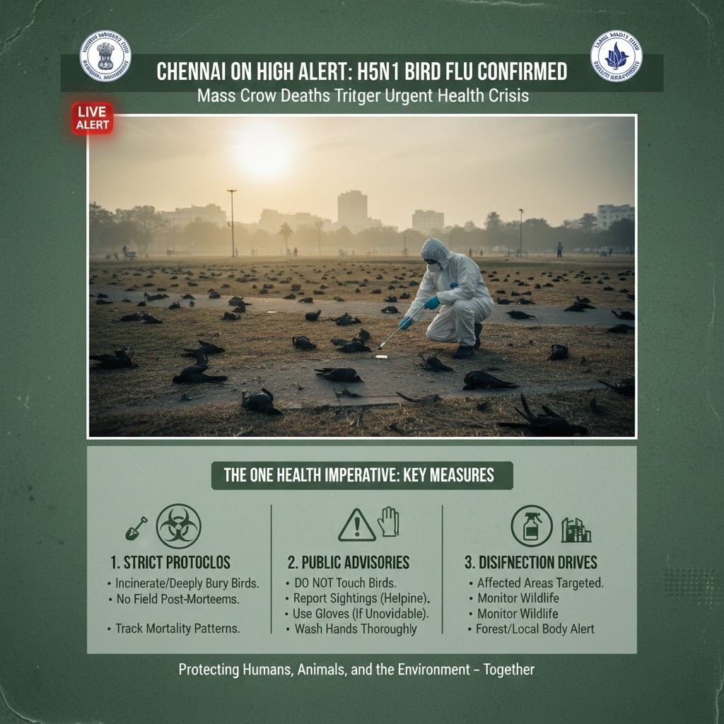 February 7, 2026 – Chennai on High Alert: H5N1 Bird Flu Outbreak Confirmed After Mass Crow DeathsAn unsettling silence has fallen over several neighborhoods in East Chennai, as residents awaken to a grim landscape of black feathers scattered across roads, pavements, and parks. The discovery of hundreds of dead crows has triggered alarm, leading authorities to confirm an outbreak of the highly pathogenic H5N1 avian influenza virus, commonly known as bird flu.