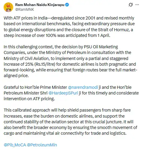 Civil Aviation Minister Ram Mohan Naidu Kinjarapu described the move as a “calibrated response to an extraordinary global crisis.” He emphasized that the staggered increase is designed to stabilize airfares, maintain critical air connectivity, and ensure that the movement of essential cargo remains uninterrupted.
