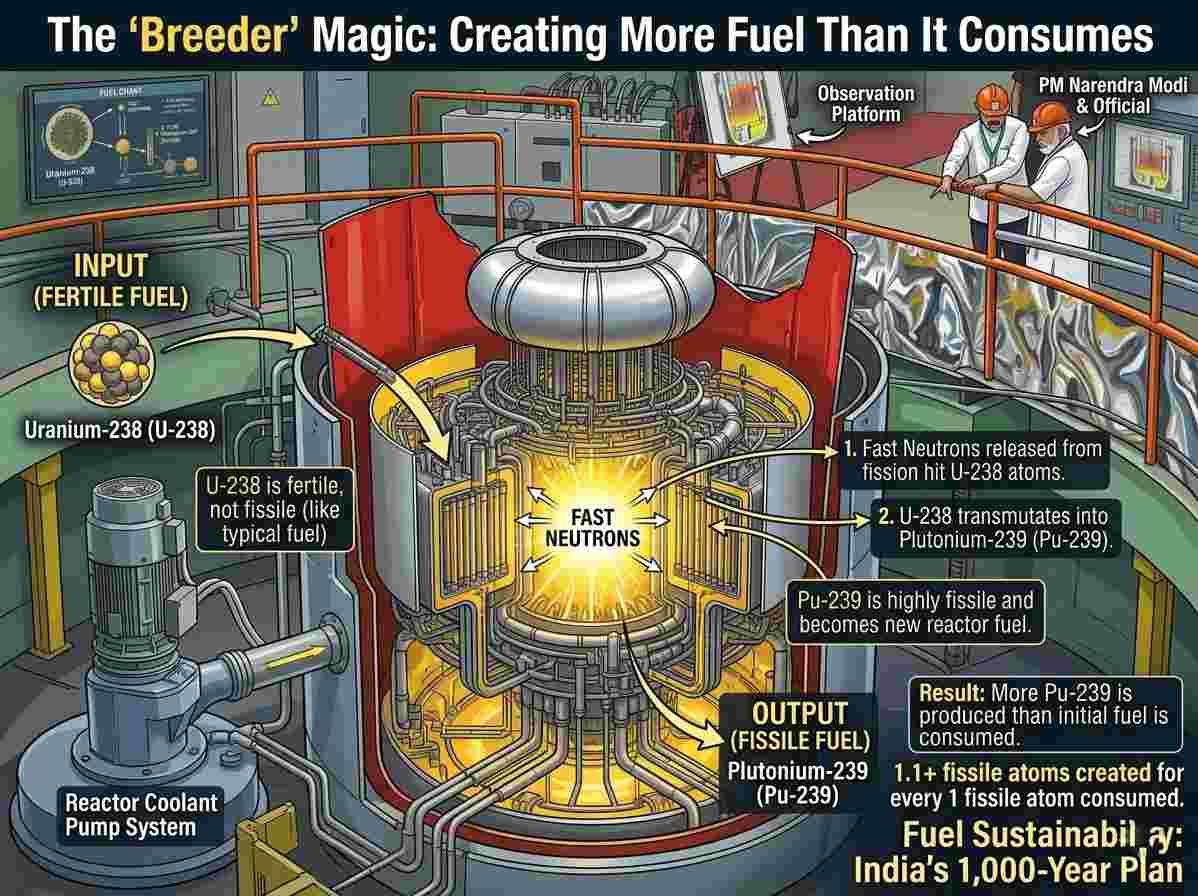 • The Process: By using high-energy “fast” neutrons, the reactor converts fertile Uranium-238 (which cannot be used as fuel directly) into fissile Plutonium-239.