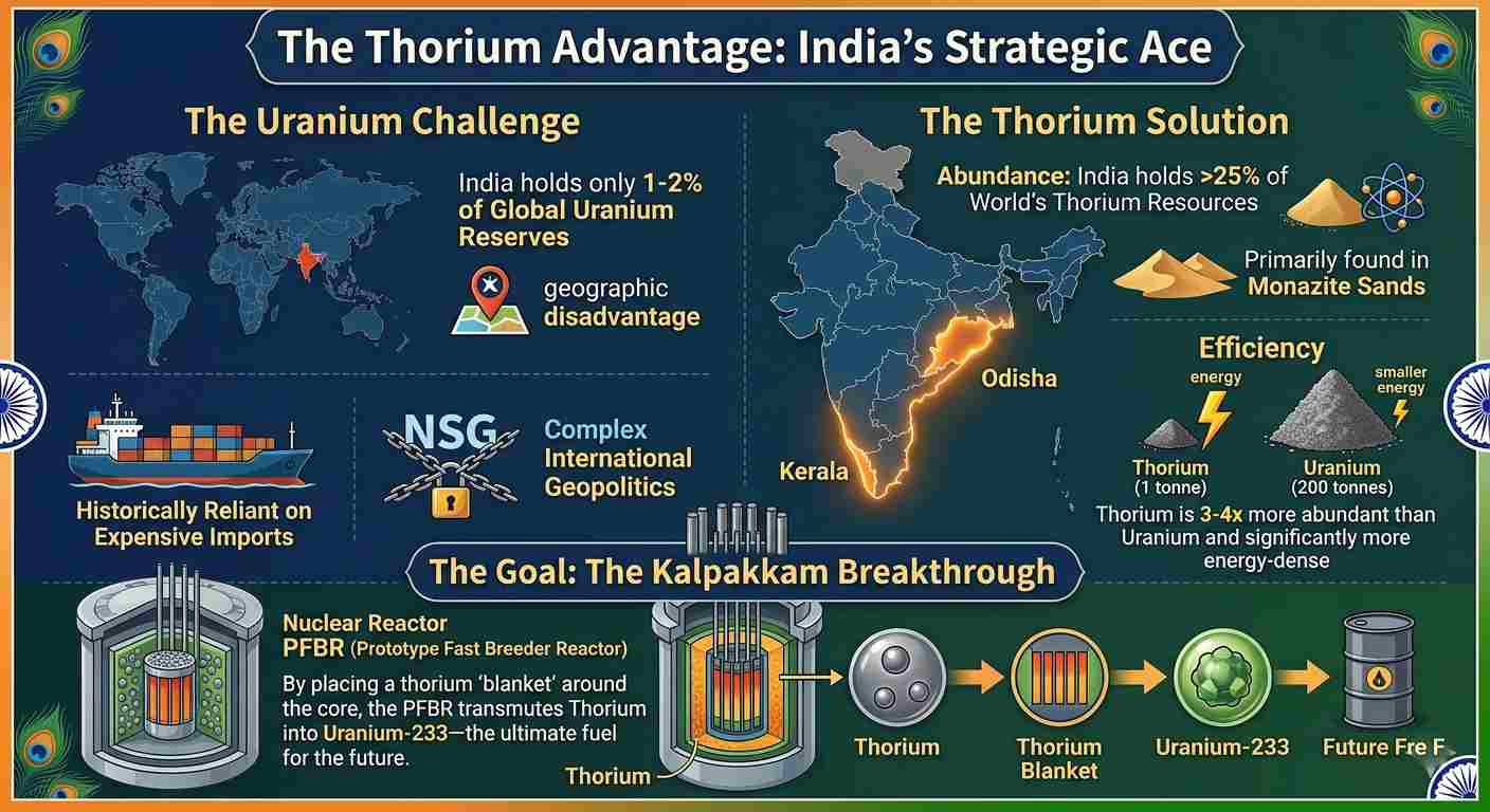 While the world has long relied on Uranium, India has faced a geographic disadvantage, holding only about 1-2% of global Uranium reserves. This has historically forced the country to rely on expensive imports and navigate complex international geopolitics (like the NSG).